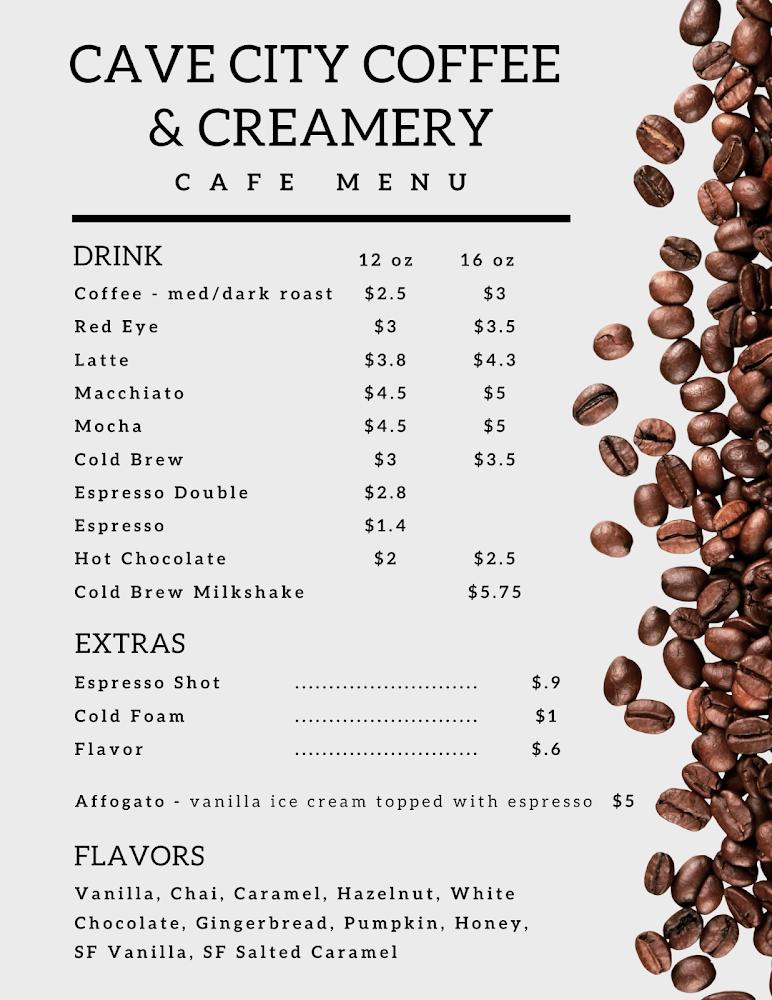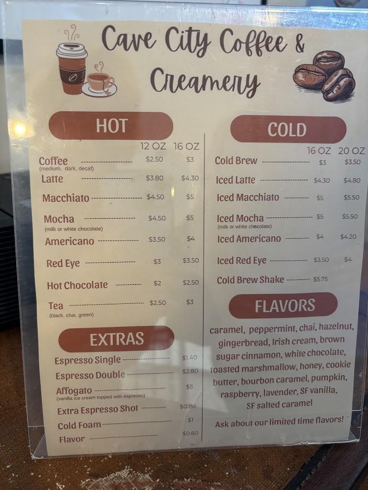 Cave City Coffee & Creamery boasts a well-rounded menu featuring both coffee and ice cream. With 15 Premium Velvet ice cream flavors, each visit can be an adventure in flavor. Don't hesitate to ask for gluten-free options when choosing a favorite scoop. The menu proudly includes special drinks like Lattes, Cold Brews, and Macchiatos.